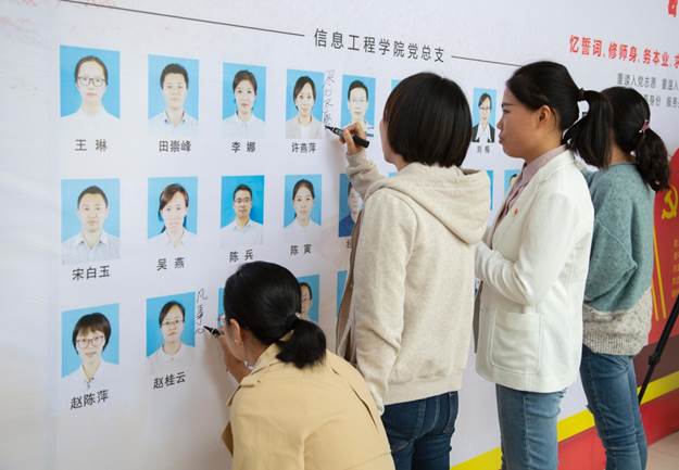 信息工程学院党总支和机电工程学院党总支联合举办“四重四亮——忆誓词、修师身、务本业、求创新,做新时代高校合格党员”主题党日活动。学校党委副书记简祖平,党委委员、副院长曹仁勇等领导参加本次活动。简祖平副书记要求广大教师党员要对照“四讲四有”合格党员标准,对照共产党人的初心使命,将本职岗位工作与学校重点、难点工作结合起来,进一步坚定理想信念,坚守责任担当。曹仁勇副院长领誓,全体党员重温了入党誓词,铮铮誓言,字字重任。最后,全体党员教师在“服务亮承诺”签名墙上签署了自己的服务承诺。