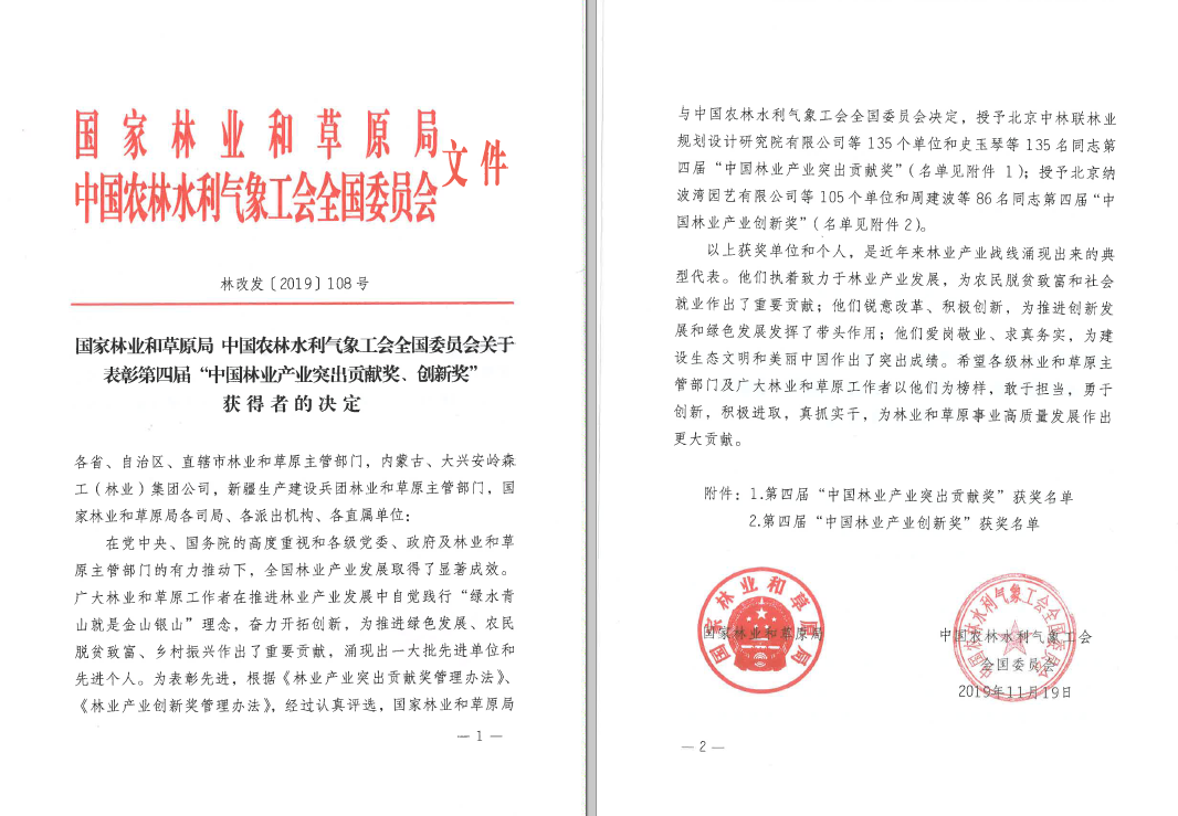 “中国林业产业突出贡献奖、创新奖”是经国务院批准设立的我国林业产业最高荣誉,由国家林业和草原局、中国农林水利气象工会全国委员会评选,旨在表彰为推进林业产业绿色发展、农民脱贫致富、乡村振兴中做出重要贡献的先进单位和先进个人。每两年评选一次,此次全国共评出“突出贡献奖”单位135家、个人135名,“创新奖”单位105家、个人86名。