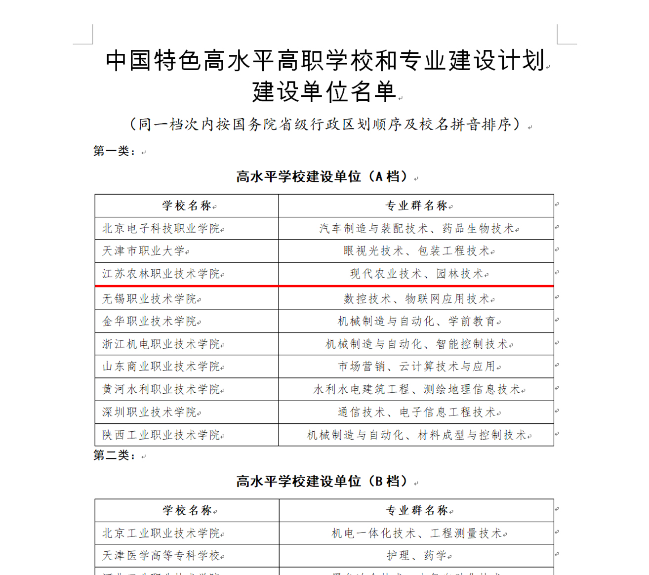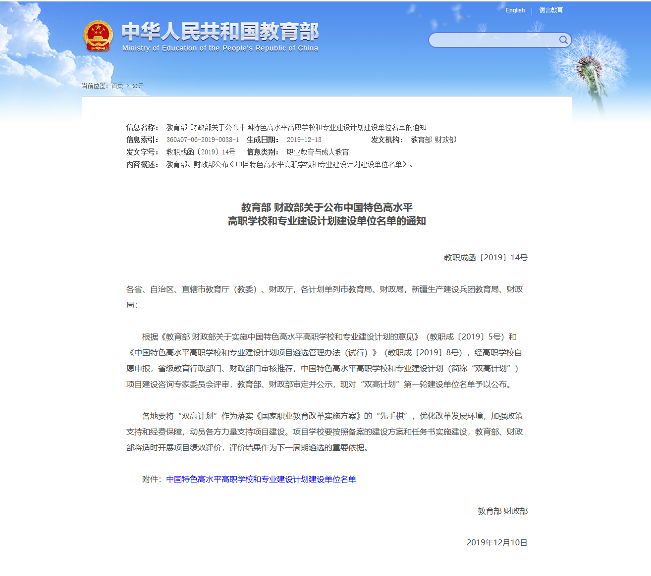 2019年12月18日,教育部、财政部发文公布“中国特色高水平高职学校和专业建设计划”建设单位名单。永利官网成功入选全国前10名的高水平学校(A档)建设单位。本次共有56所高职学校入选高水平学校建设,141所高职学校入选高水平专业群建设。