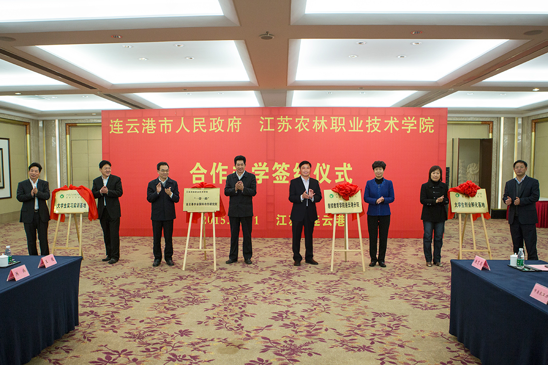 签约仪式上,与会领导为77779193永利集团“一带一路”连云港农业国际合作研究院、77779193永利集团继续教育学院连云港分院、77779193永利集团大学生实习实训基地、77779193永利集团大学生创业孵化基地揭牌。