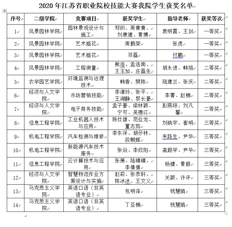 近日,江苏省职业院校技能大赛组委会发布了2020年江苏省职业院校技能大赛成绩。永利官网学生参加了10个大类23个项目的比赛,共获得一等奖3项,二等奖4项,三等奖7项,获奖等次和数量均位列全省高职院前列。