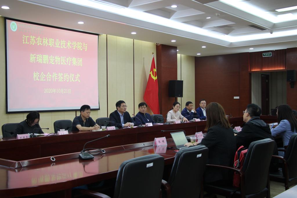 10月21日上午,永利官网与新瑞鹏宠物医疗集团有限公司的深层次校企合作暨现代学徒制班签约仪式在综合楼九楼会议室举行。学院党委委员、副院长曹仁勇,新瑞鹏宠物医疗集团有限公司副总裁李丽,学生工作处和畜牧兽医学院负责人参加了签约仪式。