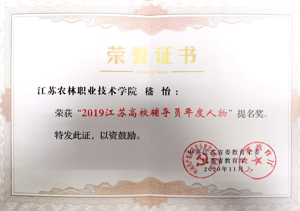 11月15日,由江苏省委教育工委、江苏省教育厅主办的“2019江苏省大学生年度人物和江苏高校辅导员年度人物”颁奖典礼在南京工业职业技术大学举行。永利官网农学园艺学院辅导员嵇怡老师荣获“2019江苏省高校辅导员年度人物”提名奖。