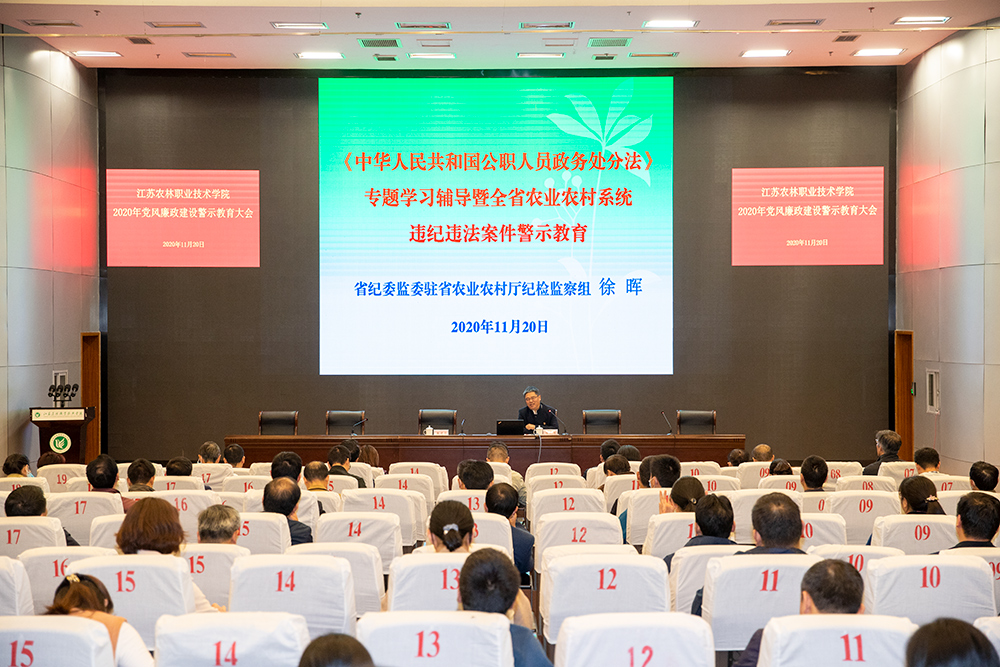 11月20日下午,学院在图书馆报告厅组织召开2020年党风廉政建设警示教育大会,会议邀请了省纪委省监委派驻省农业农村厅纪检监察组徐晖副组长作专题讲座。学院领导班子成员,学院纪委委员,各党总支纪检委员,各二级学院、各部门班子成员和内设机构负责人参加大会。学院党委书记巫建华主持会议并讲话。