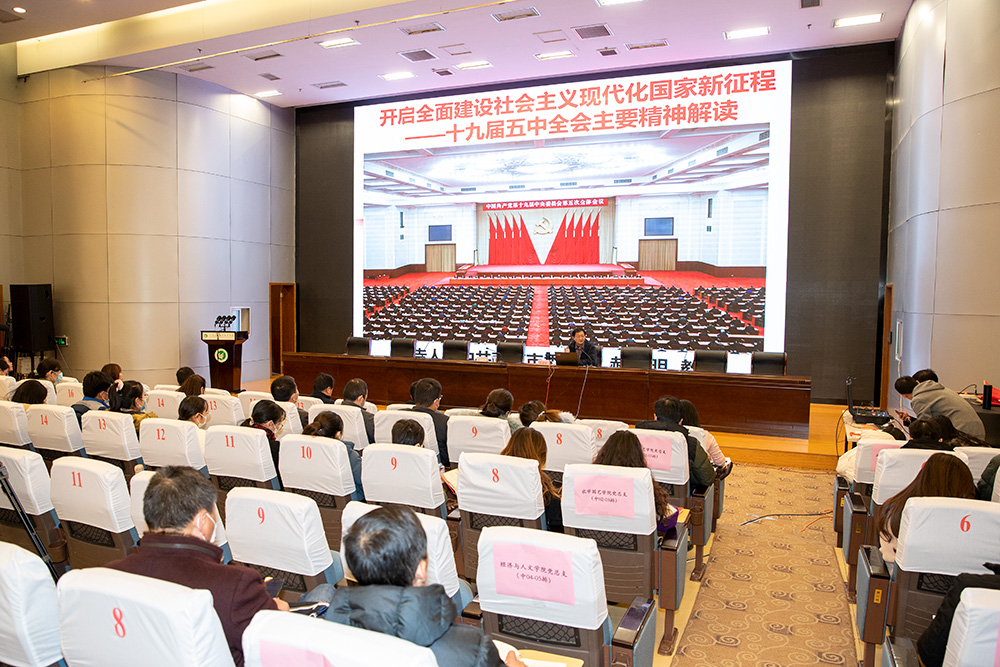 12月4日下午,永利官网在图书馆报告厅举办十九届五中全会精神专题辅导报告会,会议邀请了南京市委党校郝继明教授以“开启全面建设社会主义现代化国家新征程”为题,深入解读十九届五中全会精神。会议由党委副书记、院长简祖平同志主持,全体中层干部、教师党员代表360余人参加。