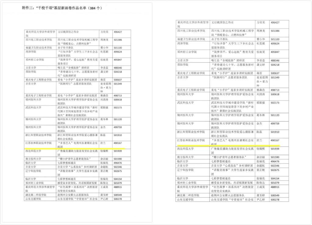 2020年“趁年轻 去基层”全国大学生“千校千项”网络展示活动中,经济与人文学院“乡里巴人”电商兴农暑期社会实践团荣获“千校千项”最美团队;学生於兰的作品荣获“千校千项”最美新画卷作品。