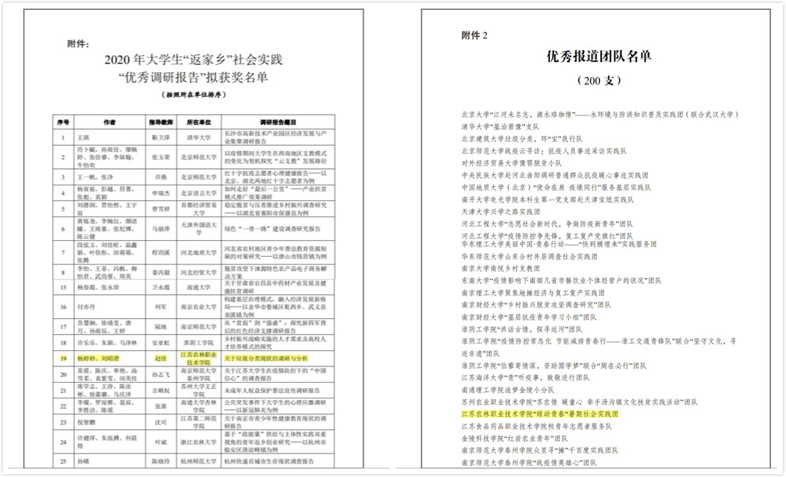 2020年全国大中专学生志愿者暑期“三下乡”社会实践“镜头中的三下乡”活动中,学院团委荣获“优秀组织单位”,风景园林学院园林风环保社组织的“绿动青春”暑期社会实践团荣获“优秀报道团队”。