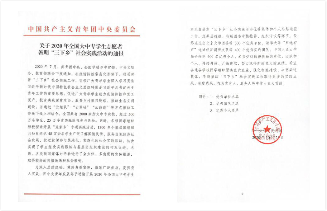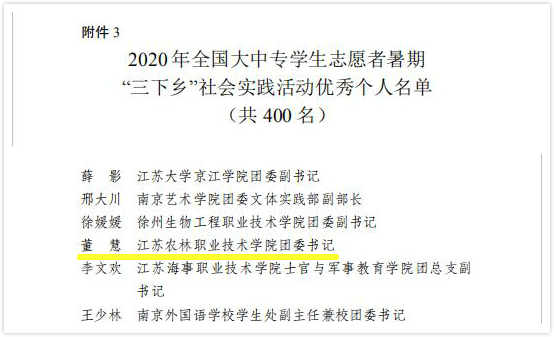 2020年全国大中专学生志愿者暑期“三下乡”社会实践活动中,董慧同志荣获优秀个人。