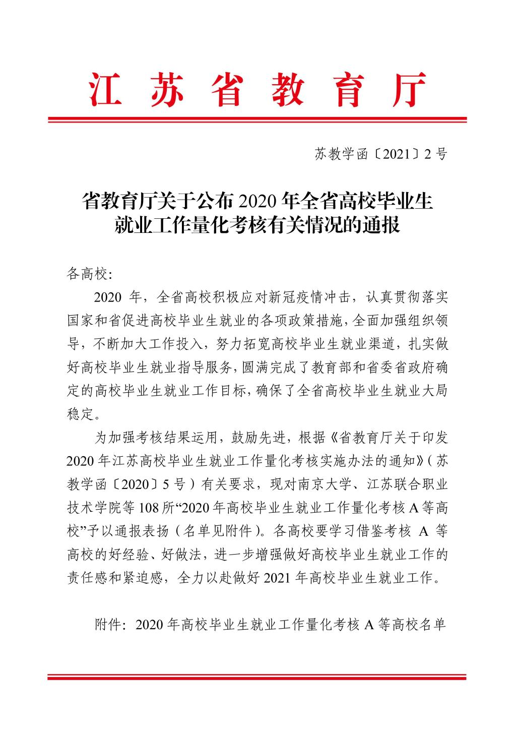 近日,省教育厅公示了《省教育厅关于公布2020年全省高校毕业生就业工作量化考核有关情况的通报》(苏教学函[2021]2号)文件,永利官网喜获“2020年全省高校毕业生就业工作量化考核A等高校”称号。