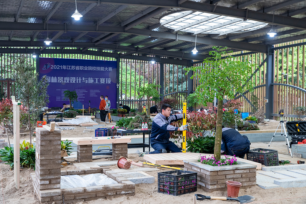 园林景观设计与施工为团队赛,比赛内容为对4m×5m的小型庭院进行景观设计和施工,两名选手在4小时内按照提供的材料、设计指标要求和现状条件,对小型庭院进行景观设计,然后由另外两名选手在10.5小时内根据设计方案,按图施工。来自全省27所高职院校的108名选手参加了该项比赛。