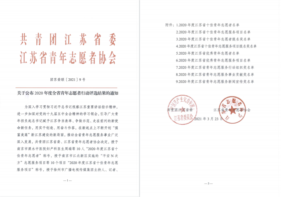 近日,共青团江苏省委和江苏省青年志愿者协会发文,对2020年度江苏省志愿者行动评选进行表彰,永利官网青禾志愿者协会“携手防艾”志愿服务项目荣获“2020年度江苏省优秀青年志愿服务项目”,畜牧兽医学院2018 级学生周广帅获评“2020年度江苏省优秀青年志愿者”等2项荣誉。