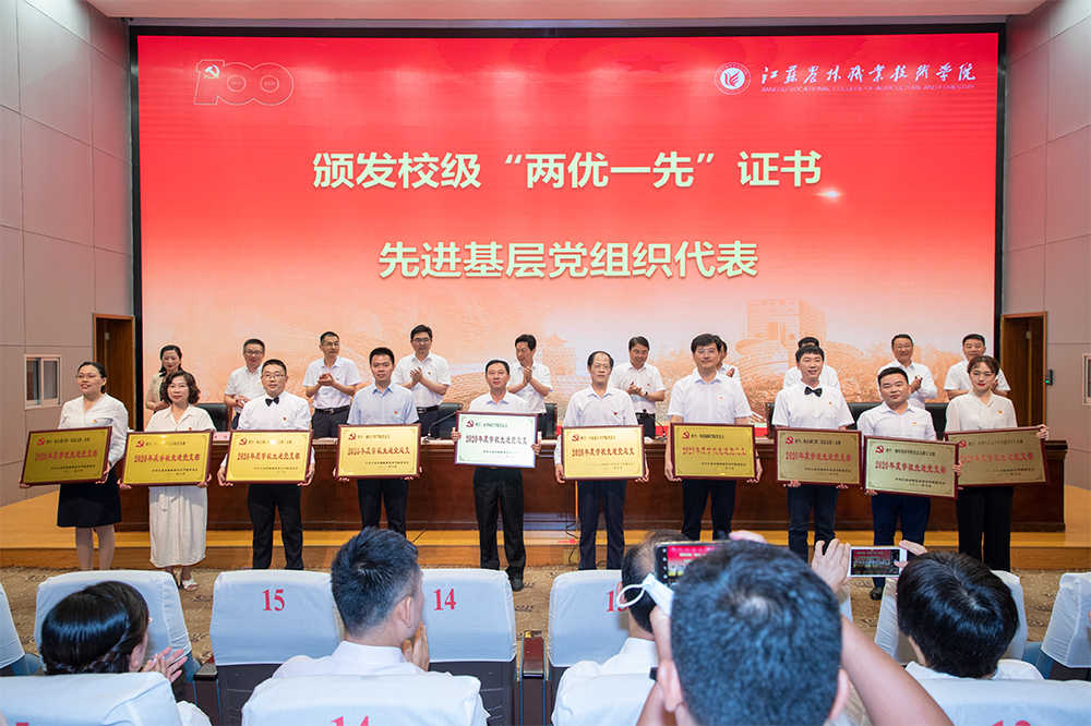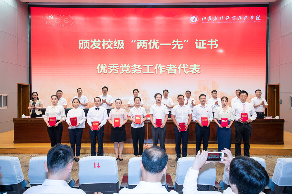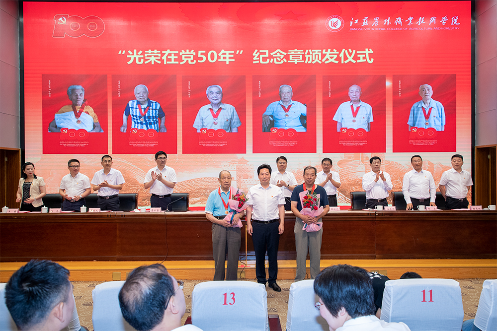 大会由党委副书记、院长简祖平同志主持。党委副书记曹仁勇同志宣读了江苏省、镇江市“两优一先”表彰名单和学院“七一”表彰决定。巫建华同志为老党员代表张三庚和黄木林了颁发“光荣在党50年”纪念奖章,主席台领导为受表彰的代表和单位颁发了荣誉证书和奖牌。新党员代表在学院机关党委第一副书记杨春梅同志的带领下举行了入党宣誓仪式。