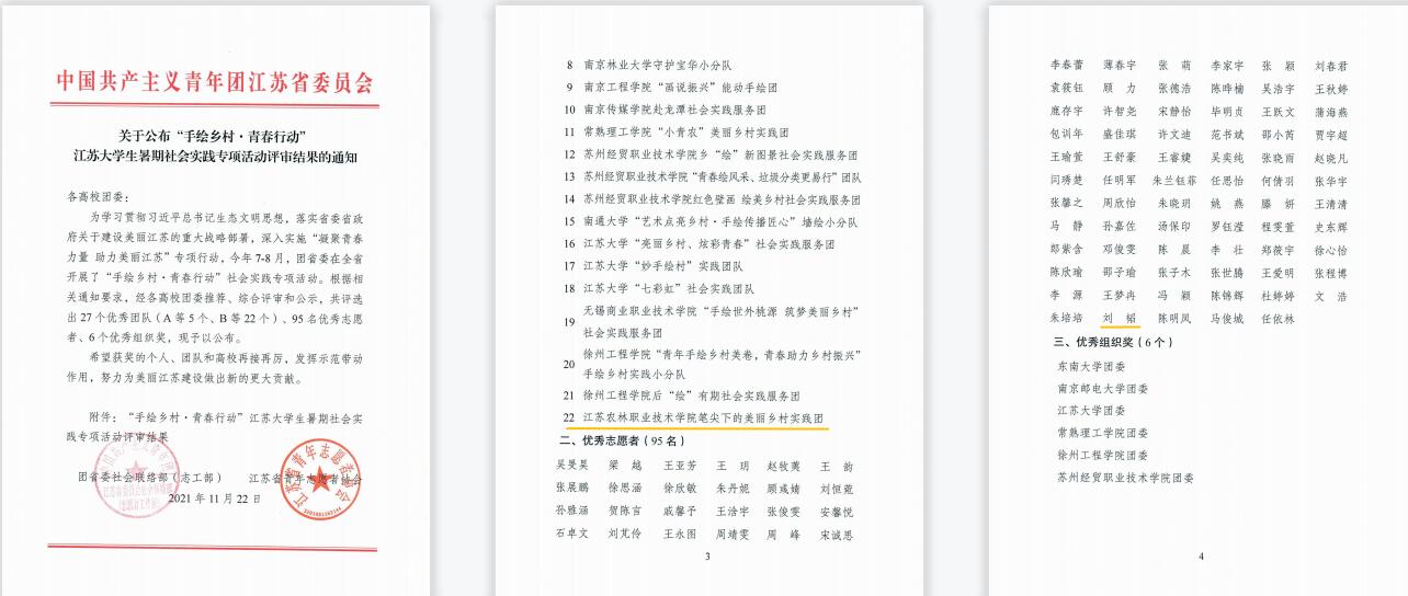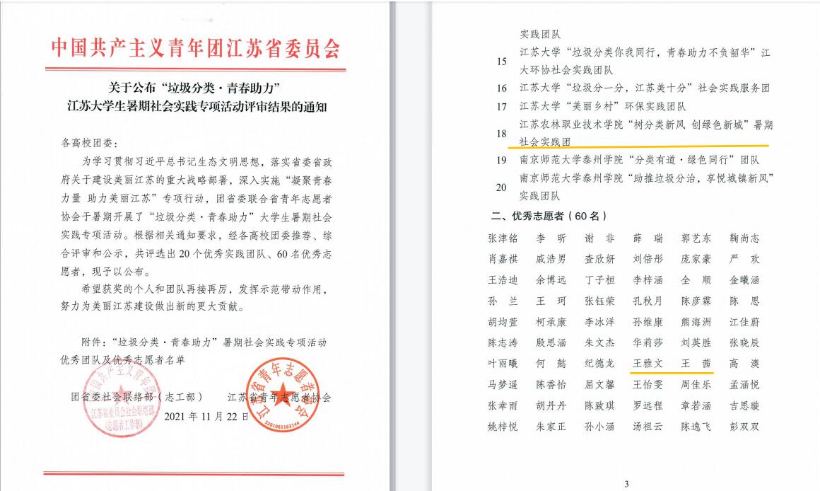 近日,由共青团江苏省委联合江苏省青年志愿者协会开展的江苏大学生暑期社会实践专项活动评审结果揭晓。永利官网“树分类新风 创绿色新城”暑期社会实践团获评“垃圾分类·青春助力”江苏大学生暑期社会实践专项活动“优秀团队”,笔尖下的美丽乡村实践团获评“手绘乡村·青春行动”江苏大学生暑期社会实践专项活动“优秀团队”B等,王雅文、王茜、刘韬3名同学获评“优秀志愿者”。