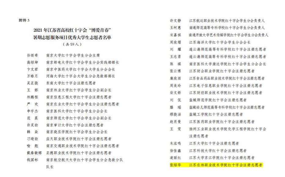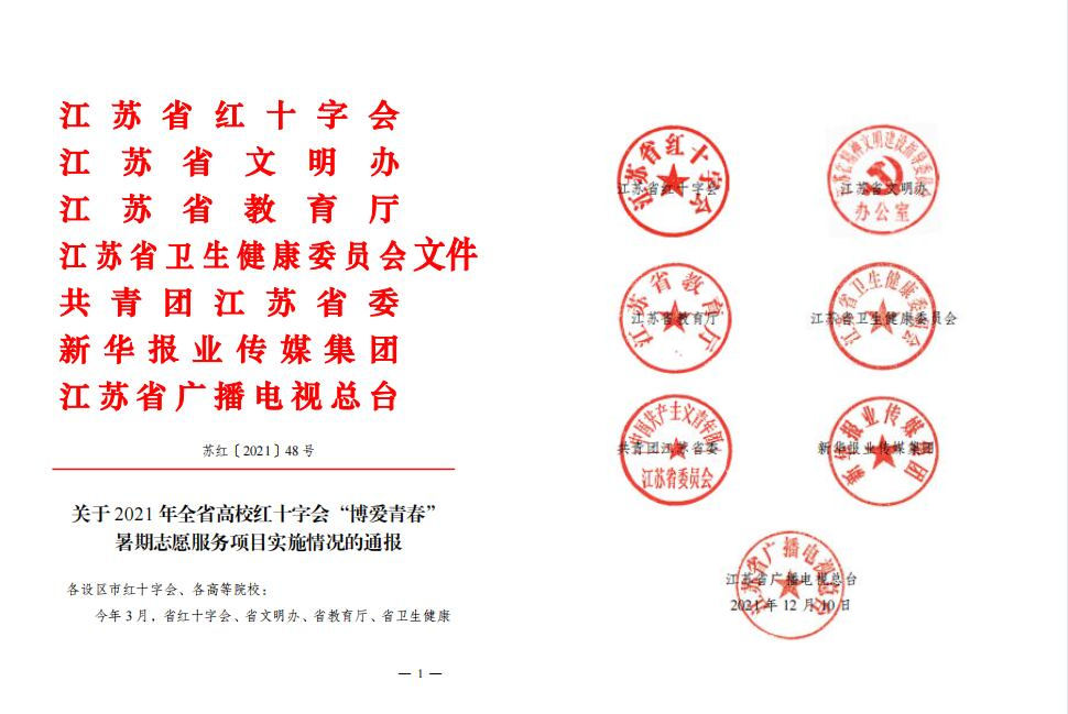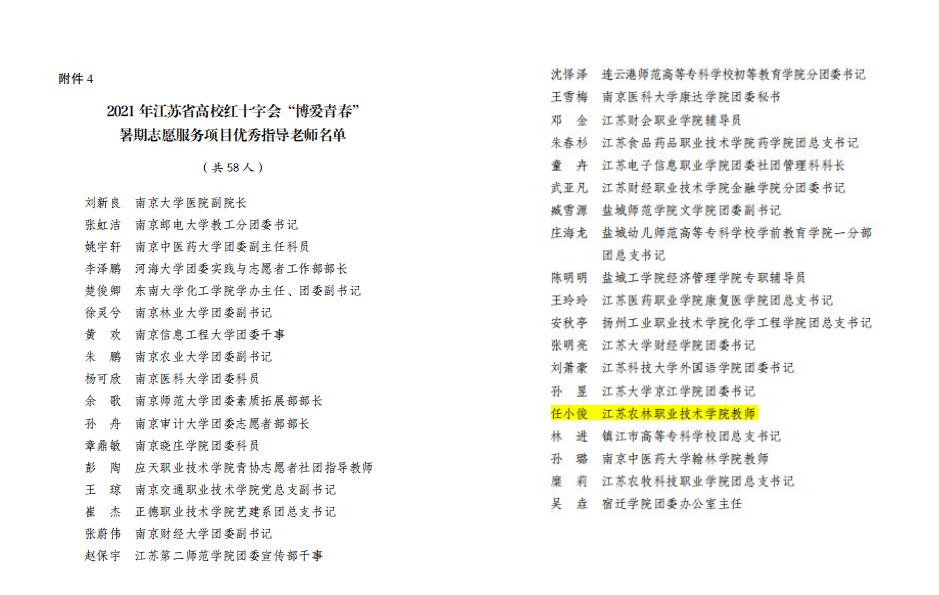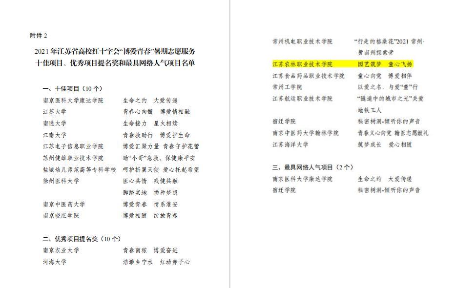 近日,省红十字会、省文明办、省教育厅、省卫生健康委、团省委、新华报业传媒集团、省广播电视总台等部门联合下发了《关于2021 年全省高校红十字会“博爱青春”暑期志愿服务项目实施情况的通报》,永利官网“园艺筑梦 童心飞扬”项目获2021 年江苏省高校红十字会“博爱青春”暑期志愿服务优秀项目提名奖,任小俊获优秀指导老师,张绍华获优秀大学生志愿者。
