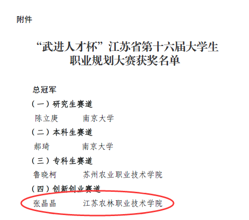 近日,“武进人才杯”江苏省第十六届大学生职业规划大赛总决赛顺利闭幕。永利官网风景园林二级学院张晶晶、周冰艳两位同学在赛场上表现优秀,分别斩获创新创业赛道总冠军和专科赛道特等奖,王晓雯同学荣获专科赛道二等奖,朱晓玲、赵佳老师荣获“优秀指导教师”称号,永利官网揽获“最佳组织奖”。本次大赛为永利官网参赛以来第一次摘得“总冠军”的桂冠。