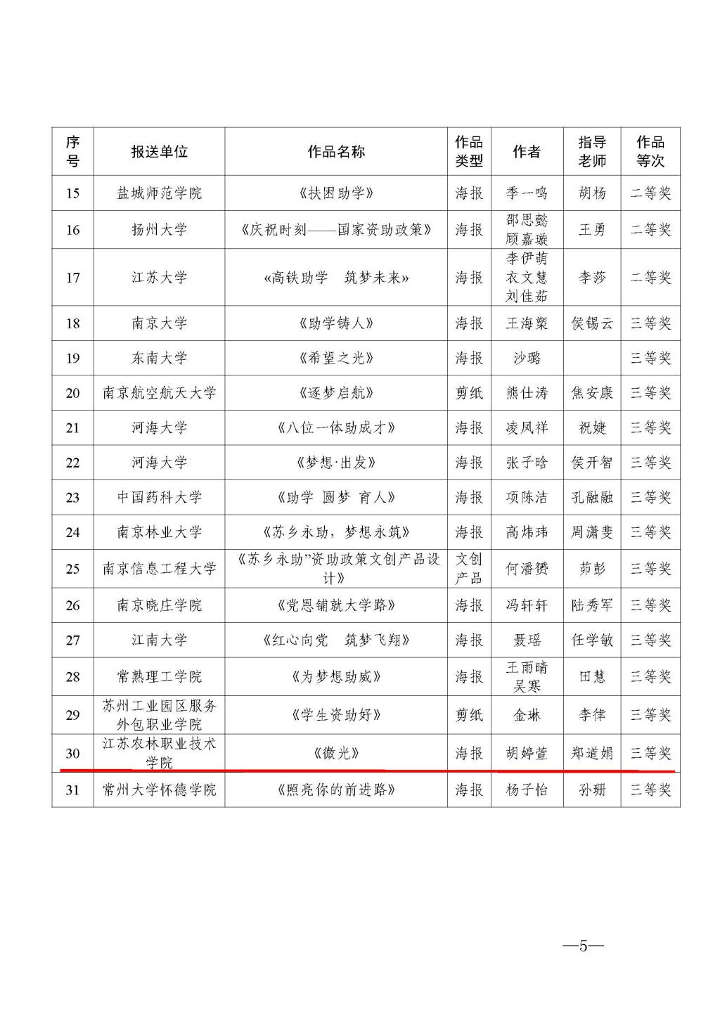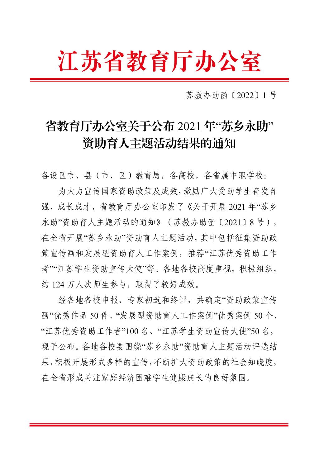 近日,江苏省教育厅组织开展的2021年“苏乡永助”资助育人主题活动评选结果揭晓,永利官网信息工程学院选送的“资助政策宣传画”《微光》荣获优秀作品三等奖,《高校“解困立志 强能”三位一体高校资助育人模式》荣获“发展型资助育人工作案例”优秀案例;学生工作处孙颖老师荣获“江苏优秀资助工作者”;风景园林学院张晶晶同学荣获“江苏学生资助宣传大使”。
