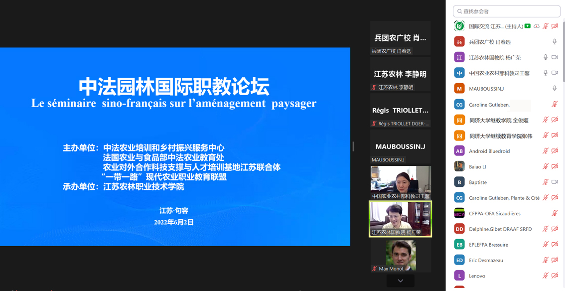 6月2日,由中法农业培训和乡村振兴服务中心、法国农业与食品部中法农业教育处、农业对外合作科技支撑与人才培训基地江苏联合体、“一带一路”现代农业职业教育联盟主办,学院承办的中法园林国际职教论坛以线上会议的形式召开。中国农业农村部科技教育司教育处副处长王馨、法国驻华大使馆经济处农业参赞周佳阳(Jo Cadilhon)、法国农业部中法农业教育合作主任马克斯、法国农业部教育研究总局园艺景观署负责人雷吉斯·特里奥特(Régis Triollet)出席会议。