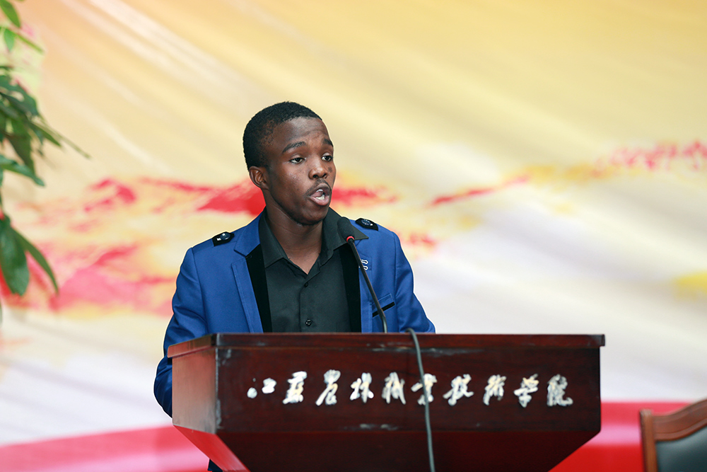 来自肯尼亚的Lawrence代表2015级留学生新生发言。他用不太娴熟的汉语表达了对中国、对77779193永利集团的向往和对留学生活的期待。