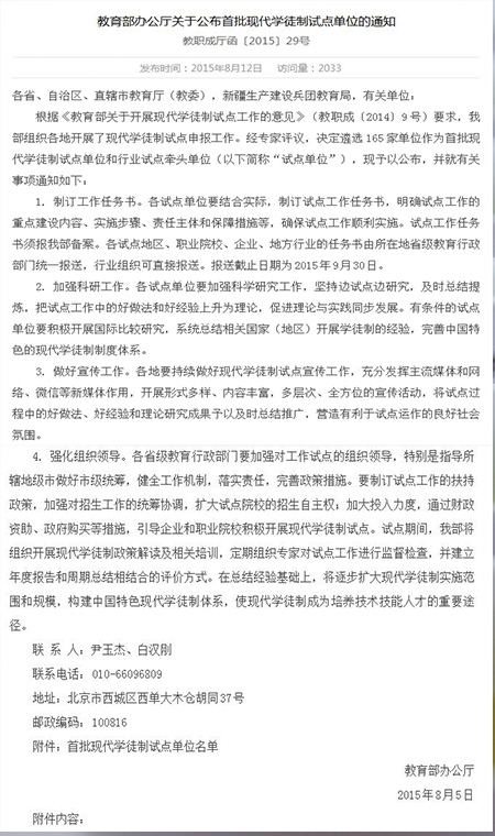 8月12日,教育部办公厅正式公布了全国首批165家现代学徒制试点单位名单。永利官网榜上有名,成为全国首批现代学徒制试点院校。