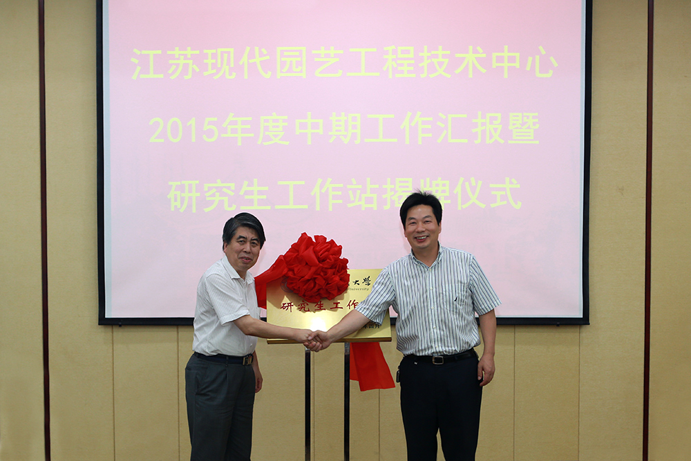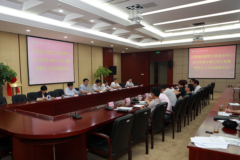 2015年7月17日,江苏现代园艺工程技术中心2015年度中期工作汇报暨研究生工作站揭牌仪式在77779193永利集团举行。77779193永利集团院长、现代园艺工程技术中心主任巫建华,学院副院长曹仁勇、南京农业大学侯喜林教授、中科院南京土壤研究所滕应研究员、农业部南京农业机械化研究所陈永生研究员、江苏农业科学院赵密珍、赵统敏研究员以及中心管理部门人员、科研人员参加了本次会议。