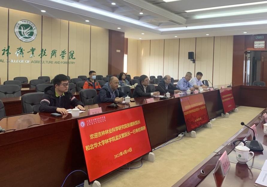 4月10日上午,吉林省林业科学研究院院长张建秋等一行4人和北华大学林学院院长孟庆繁教授等一行2人来永利官网交流调研。学院党委副书记、院长潘永圣,科技开发处、风景园林学院等部门负责同志和相关专业老师参加了座谈会。