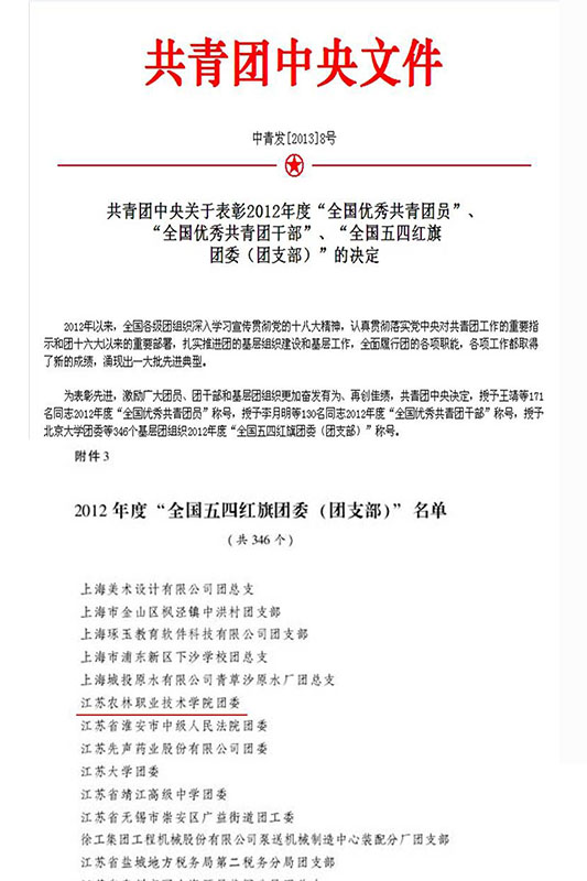 旗帜飘扬,青春梦想,在全院上下喜迎90周年华诞之际,日前从共青团中央传来喜讯,永利官网团委荣获2012年度“全国五四红旗团委”称号。“全国五四红旗团委”是团中央授予基层团组织的最高荣誉,永利官网是江苏省唯一获此殊荣的高职高专院校。
