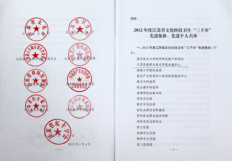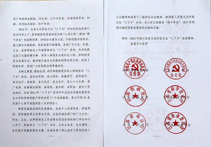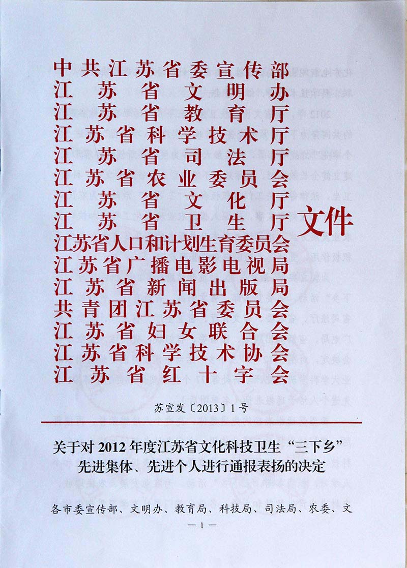 根据《关于对2012年度江苏省文化科技卫生“三下乡”先进集体、先进个人进行通报表扬的决定》精神,永利官网被江苏省委宣传部、省文明办、省教育厅等十五家单位联合表彰为2012年度江苏省文化科技卫生“三下乡”先进集体。