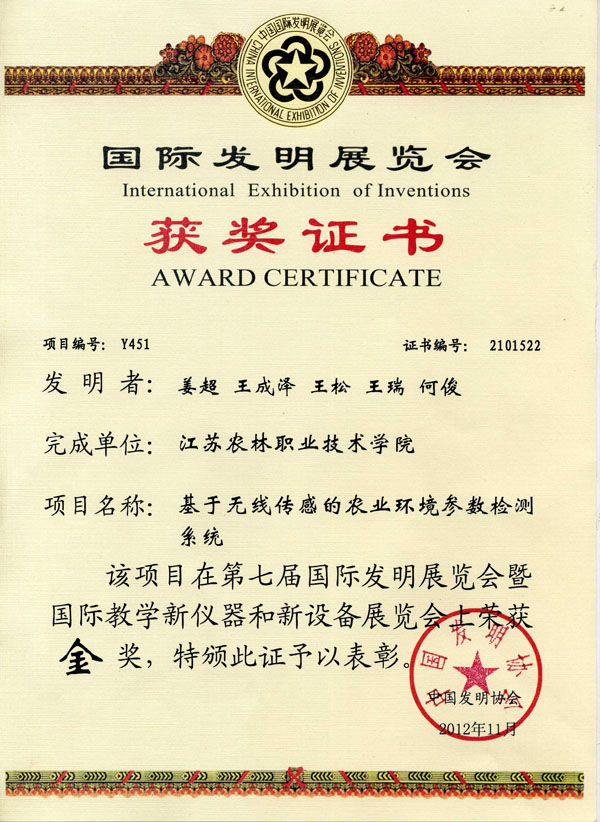 2012年11月10~12日,由中国发明协会、发明者协会国际联合会(IFIA)、江苏省科技厅、苏州市人民政府共同主办,江苏省知识产权局、昆山市人民政府承办的第七届国际发明展览会在江苏昆山国际会展中心举行。永利官网就业指导中心选送的机电工程系学生创新作品“基于无线传感的农业环境参数检测系统”项目在此次展会上荣获金奖,“智能客厅菜园系统”获得银奖。此外,“基于无线传感的农业环境参数检测系统”项目还获得宝钢青少年发明奖。