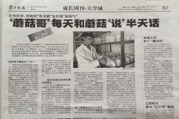 10月24日,《扬子晚报》(《成长周刊·大学城》(B7)版)以《“蘑菇哥”每天和蘑菇“说”半天话》为题,大篇幅报道了永利官网生物工程系10生物技术及应用班崔阳网同学的成长故事。