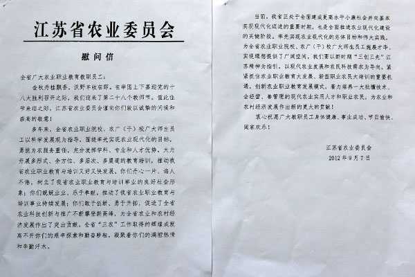 金秋丹桂飘香,沃野丰收在即。在第二十八个教师节来临之际,江苏省农业委员会发来慰问信,向永利官网教职员工致以诚挚的问候和崇高的敬意。