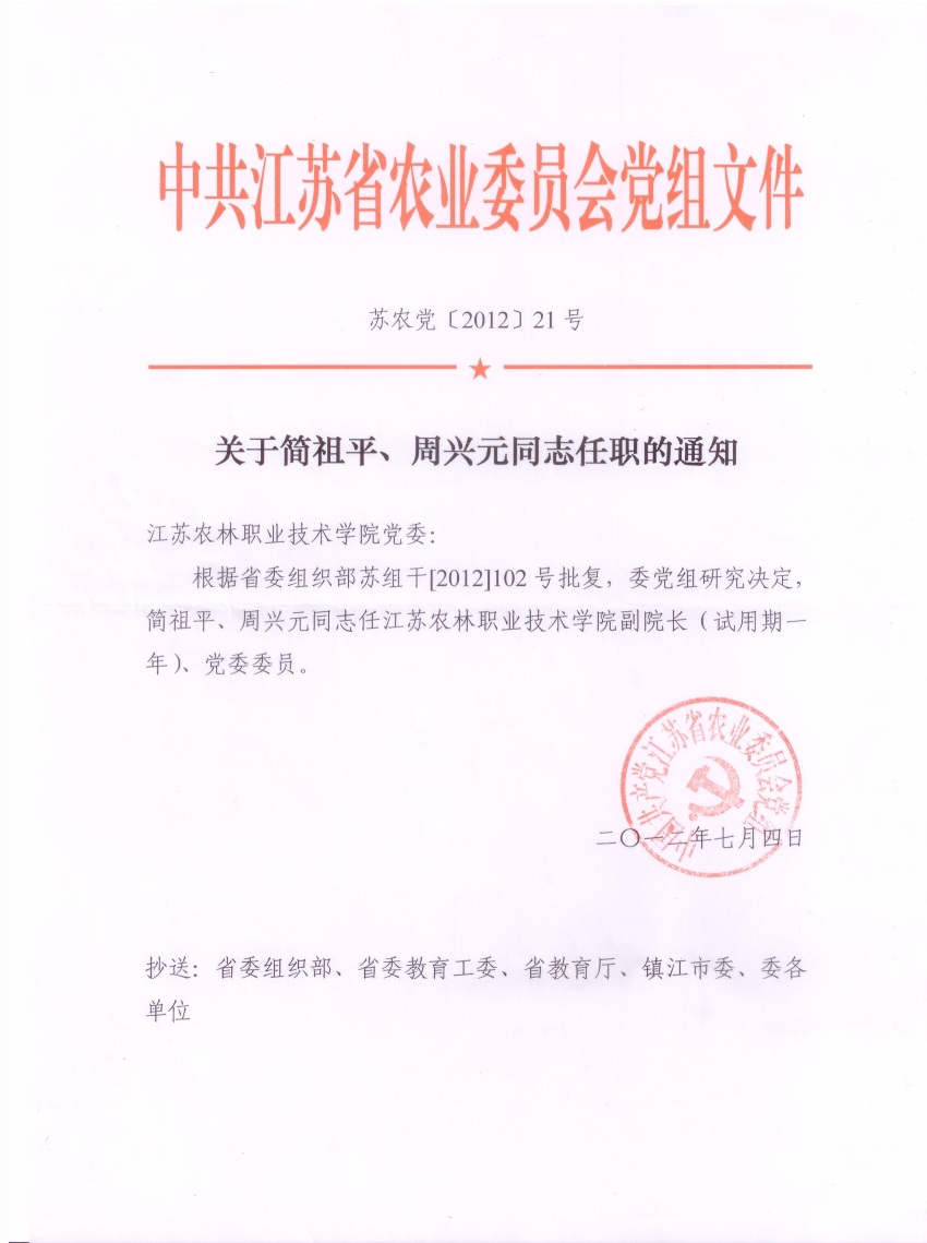 根据省委组织部苏组干[2012]102号批复,经中共江苏省农业委员会党组研究决定,简祖平、周兴元同志任永利官网副院长(试用期一年)、党委委员。