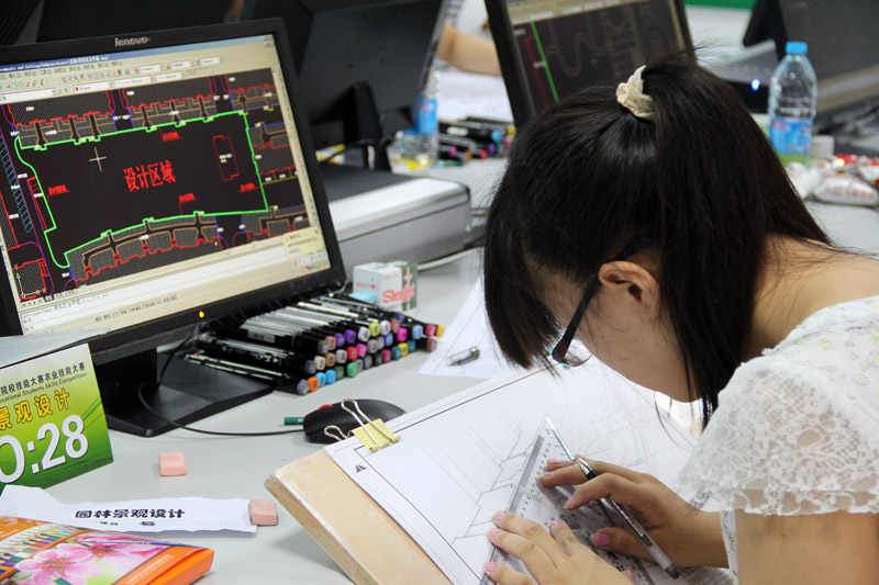园林景观设计是今年新增的比赛项目,来自全国各地职业院校的58名风景园林专业的学生参加了本次比赛。比赛以团体赛形式,两人一组,共29组。参赛选手在5个小时的时间内,根据提供的现场各自完成一套居住区中心花园园林景观设计的完整设计方案。评委们将从方案主题构思、方案整体效果、效果图以及设计说明、团队合作等七个方面对各组进行客观评价。