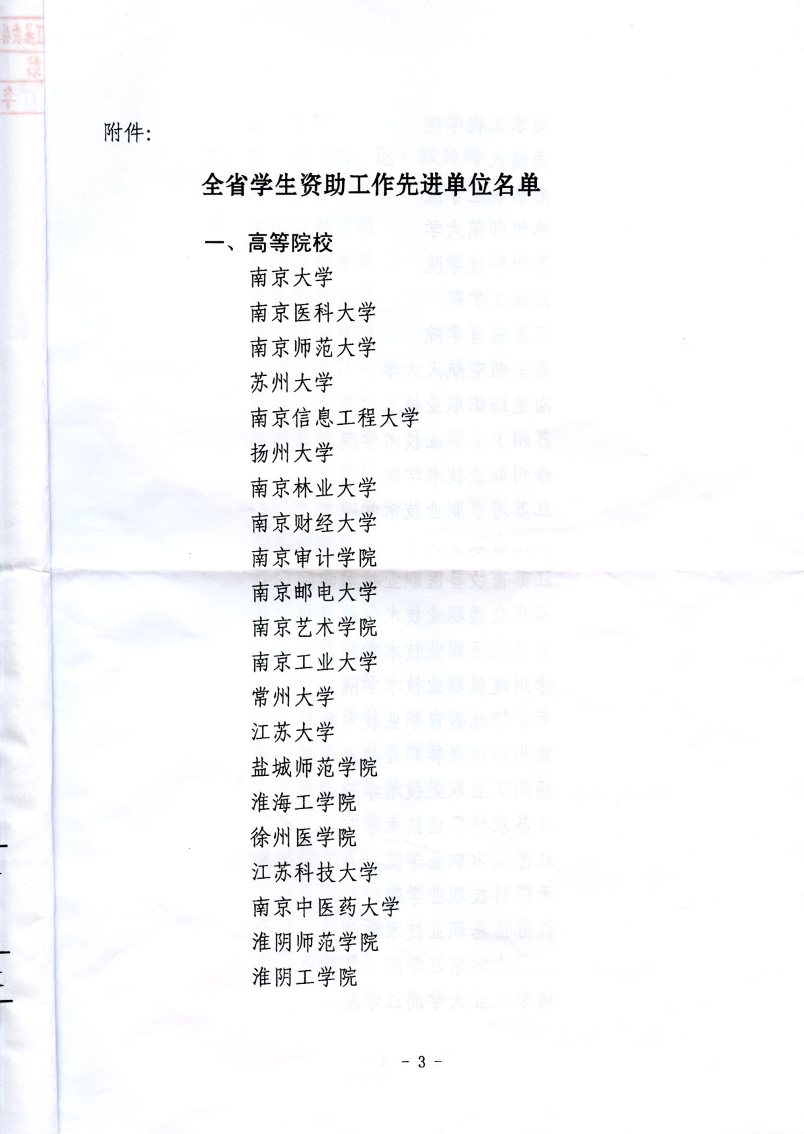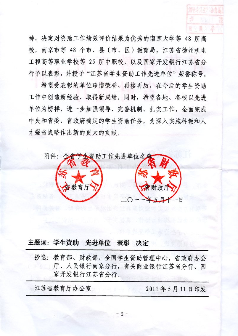 根据《省教育厅、省财政厅关于表彰全省学生资助工作先进单位的决定》(苏教助[2011])11号)文件精神,永利官网被省教育厅、财政厅授予“江苏省学生资助工作先进单位”荣誉称号。