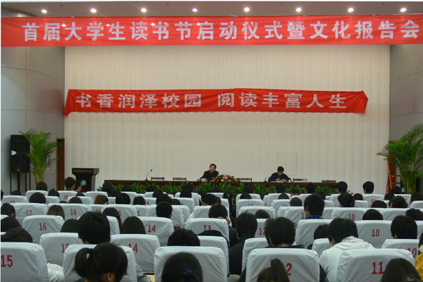 本次读书节内容包括镇江文化报告会、读者风云榜─评选优秀读者活动、签签书情─书签设计大赛、精英擂台─利用图书馆电子资源技能比赛和共知共享─“我最喜爱的一本书”好书推荐。图书信息中心曹金留主任代表主办单位详细介绍了本次读书节活动情况,学生代表徐幸宣读了本届大学生读书节倡议书。