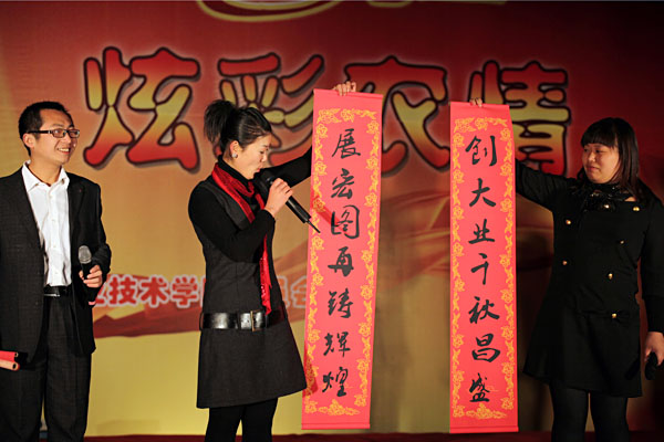 本次元旦晚会,共分三个篇章,在演出组织形式上也有了一定的创新:一是录制新年寄语,利用现场视频播放了学院领导、专家教授和广大师生对学院的新年祝福;二是增设了送春联、班级祝福等环节,营造了浓厚的欢乐祥和的节日氛围;三是师生同台献艺,共叙师生情谊,共祝学院美好未来。