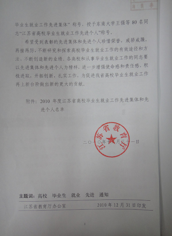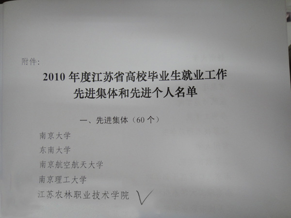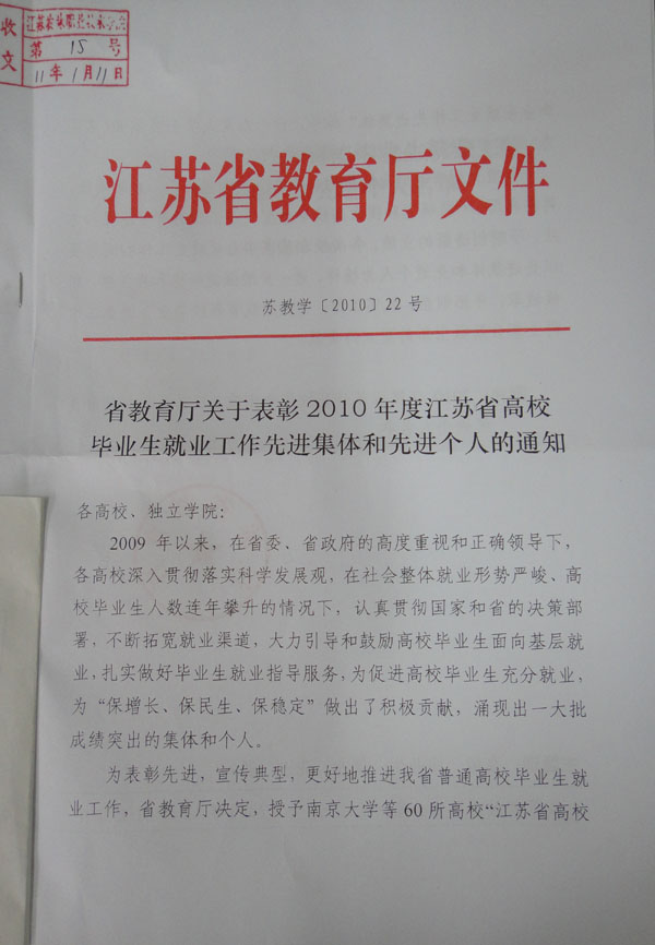 2010年12月31日,江苏省教育厅下发了《省教育厅关于表彰2010年度江苏省高校毕业生就业工作先进集体和先进个人的通知》(苏教学〔2010〕22号),永利官网被评为“江苏省高校毕业生就业工作先进集体”,这是永利官网自2006年以来连续第5次获此表彰。同时,永利官网学生工作处处长毕德全同志被评为“江苏省高校毕业生就业工作先进个人”。
