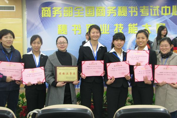 12月4日、5日,永利官网社艺系文秘专业4名学生参加了由商务部全国商务秘书考试中心主办、南京城市职业技术学院承办的首届秘书职业技能大赛。经过理论测试、写作测试、书法测试、个人及团体才艺展示五环节的激烈角逐,我专业代表队喜创佳绩,共获九项大奖:团体二等奖,个人一等奖两项、二等奖一项、三等奖两项,优秀指导教师奖三项。其中,魏倩获个人职业能力一等奖,朱叶茹获个人职业能力二等奖,张玉获书法一等奖、个人职业能力三等奖,邵明宣获个人职业能力三等奖,孔祥静、邰沛沛、张丹黎三位老师获优秀指导教师奖。