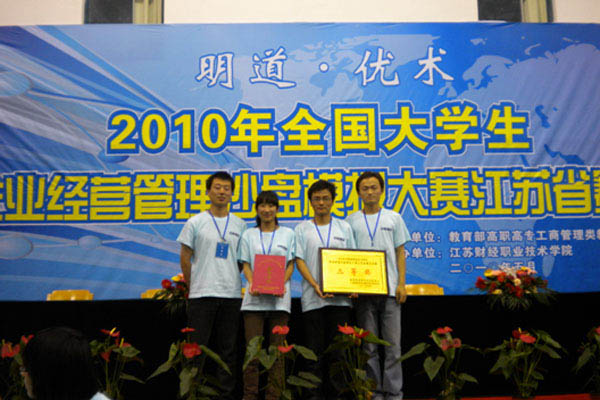 2010年5月29日,由教育部高等学校高职高专工商管理类专业教学指导委员会主办、江苏财经职业技术学院承办的“2010年全国高职高专大学生物流管理沙盘模拟大赛江苏省赛区竞赛”中,共有31个代表队参加了本次角逐。永利官网08物流管理专业的李建刚、尤茂林、任纬、朱婷婷四位同学组成的代表队,经过8个半小时的激烈竞赛,最终以小组第四名的成绩荣获三等奖。此次竞赛,不仅提升永利官网物流管理专业学生的技能水平,同时为永利官网教师搭建了与其他院校同仁间相互学习、交流和提高的平台。