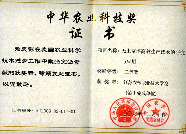 永利官网“无土草坪高效生产技术的研究与应用”项目(俞禄生副院长主持)荣获中华农业科技二等奖。这一成果的获得不仅凝聚了永利官网草业人三十年的心血,更是对永利官网“点草成金、致富农民”的充分肯定。这一标志性成果不仅填补了学院多年来无高级别奖项空白,也为全国农业高职院争得了荣誉(迄今为止最高奖)。