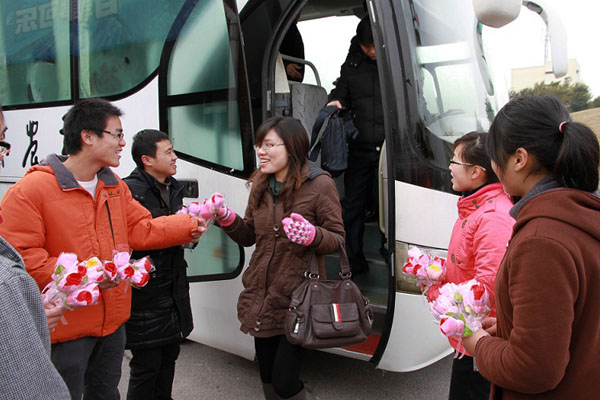 3月8日早上7:30,江宁校区管委会汪国好副主任带领相关教师在校门口迎接上班的女教职工们,向她们致以节日问候,并一一为她们献上鲜花;风景园林系团总支的插花社团,为每一位女教师办公室送去了一束鲜花;农艺系、生物工程系团总支举办了“丝带传祝福,贺卡寄真情”活动,将同学们自制的精美贺卡,写满了祝福语挂在南校区主干道路两旁的树上,并为每位女教师送上精心包装的橙子,祝福老师们心想事成(橙),工作顺利。
