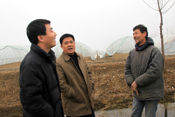 在车门乡蔬菜基地大棚前与种植户交谈