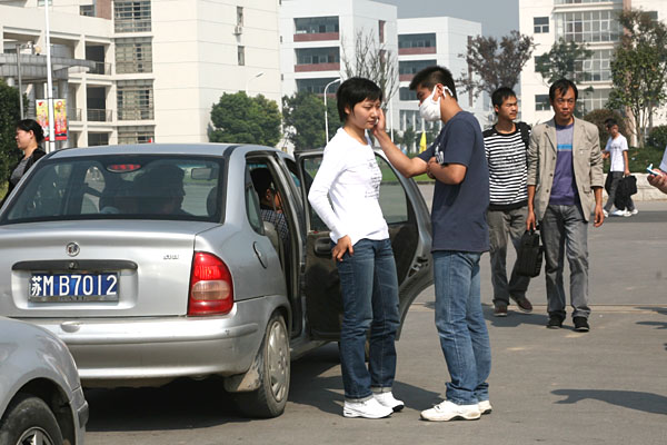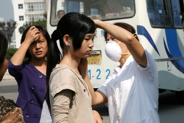 校医们为每一位新生测量体温