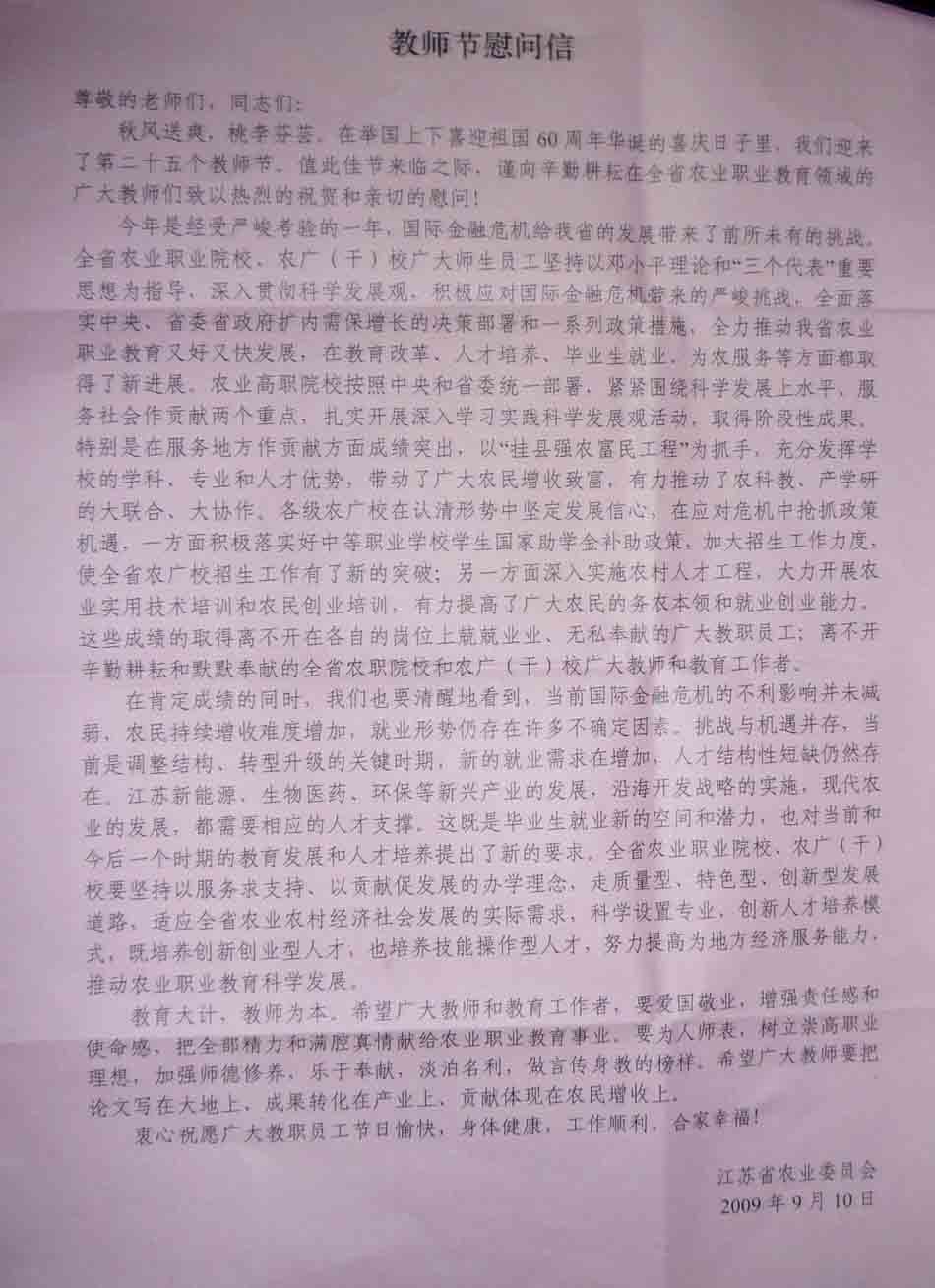 今天是第25个教师节,江苏省农业委员会特发来慰问信,对永利官网全体教师表示节日的问候和美好的祝福。