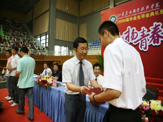 典礼上,黄焱院长作了热情洋溢的讲话,希望毕业生在自己的工作岗位上要踏实做人,决不漂浮钻营;要终身学习,绝不固步自封;要经历坎坷,决不轻言放弃。黄焱院长还亲自为毕业生代表颁发了毕业证书。苏小冬副院长宣读了《2009届优秀毕业生表彰决定》。教师代表周兴元老师,毕业生代表韦海翔同学,在校生代表孟路琴同学分别在毕业典礼上发了言。