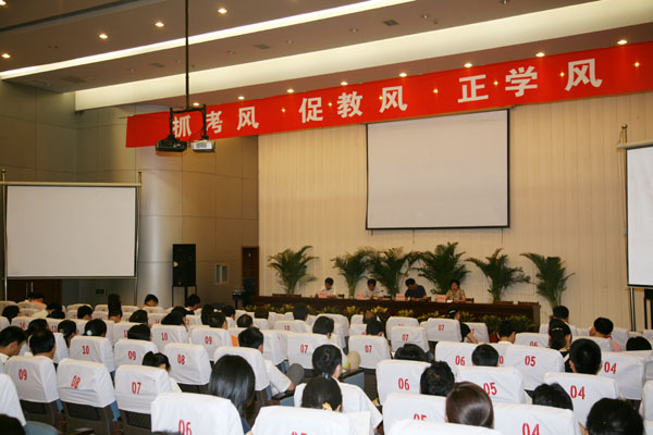 本次大会的主题是“抓考风、促教风、正学风”。对于即将开始的期末考试和国家英语等级考试,学院高度重视考风考纪的教育。要求各系广泛开展考风考纪宣传和诚信考试主题教育活动,倡导学生诚信为人、诚实应试;明确考试有关工作人员的职责,强化责任意识。严格杜绝学生考试舞弊行为和监考人员的违纪行为,努力在校园内形成诚信守纪的文明考风和公平公正的竞争氛围,并通过整肃考风考纪,促进良好教风、学风的形成。