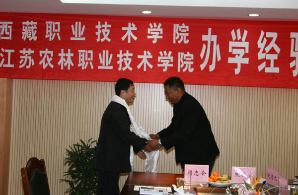 两院经验交流会在综合楼八楼会议室举行。李振陆副院长及相关专业负责人出席会议。会议结束时,索朗欧珠主任代表西藏职业技术学院向黄焱院长献上了洁白的哈达和来自雪域高原的美好祝愿,并向永利官网赠送了一副具有藏族特色的手工艺品作为纪念。