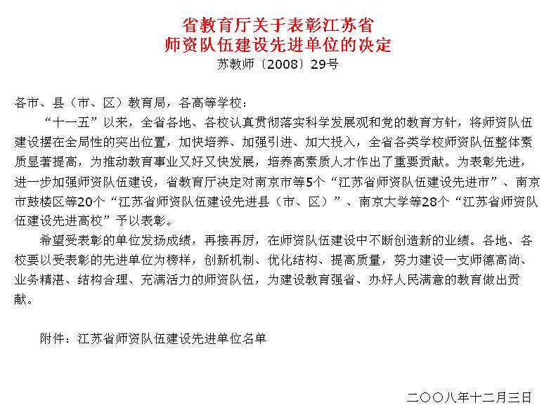 日前,根据《省教育厅关于表彰江苏省师资队伍建设先进单位的决定》(苏教师〔2008〕29号),永利官网荣获“江苏省师资队伍建设先进高校”称号。 (组宣人事处)