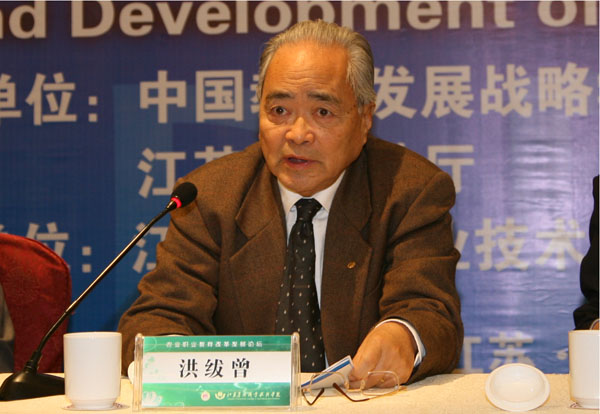 洪绂曾会长在讲话中充分肯定了改革开放以来农业职业教育取得的成绩。他说,改革开放30周年之际,认真总结经验,逐步建立、完善具有中国特色的农业职教事业,意义重大。农业职业教育改革发展还存在诸多问题,如农业职业教育的功能定位、体系建设及科学评估标准、教学方法与教材内容的改革、投入机制与自我发展等,都应该深入地研究探讨。当前,办好农业职业教育应当做到:一要坚持行业指导,加强和教育、农业部门联系;二要加强创业教育,把培养创业型人才和高技能新型农民作为重要任务;三要坚持产学研结合,实行校企合作,实现学校、企业发展“双赢”;四要加强师资队伍建设,特别是加强“双师”型教师队伍建设等。