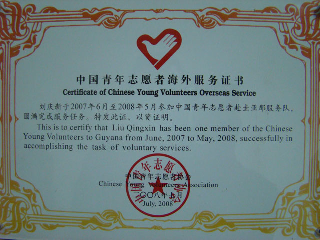 2007年6月,永利官网刘庆新同志作为中国江苏首批赴圭亚那青年志愿者之一,远赴圭亚那开展志愿者服务活动。过去的一年里,远离祖国和亲人,克服语言、文化、环境等各种困难,深入城市、乡村和各级机构,在教学等领域大力开展志愿者服务,用劳动、智慧和汗水谱写了一曲动人的志愿者之歌。 目前,刘庆新同志被共青团江苏省委评为“江苏省新长征突击手”。学院团委号召全院广大师生团员学习团结友爱、助人为乐、甘于奉献的志愿者精神,各系团组织要积极开展志愿者服务活动,进一步学习社会主义荣辱观,大力弘扬志愿者服务精神。