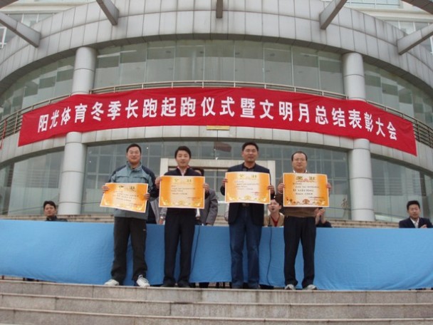 10月26日,永利官网在北校区图书馆前举行了第二届阳光体育冬季长跑起跑仪式暨文明月总结表彰大会。仪式上,学生工作处处长、团委书记毕德全对文明活动月中表现突出的先进集体和个人进行了表彰,他鼓励受表彰的同学再接再厉,把文明月中的优秀表现延续下去,并号召全院同学向他们学习。体育教研室谢谦梅主任介绍了永利官网第二届学生阳光体育冬季长跑活动方案,教务处赵明珍处长为该起跑仪式发令。